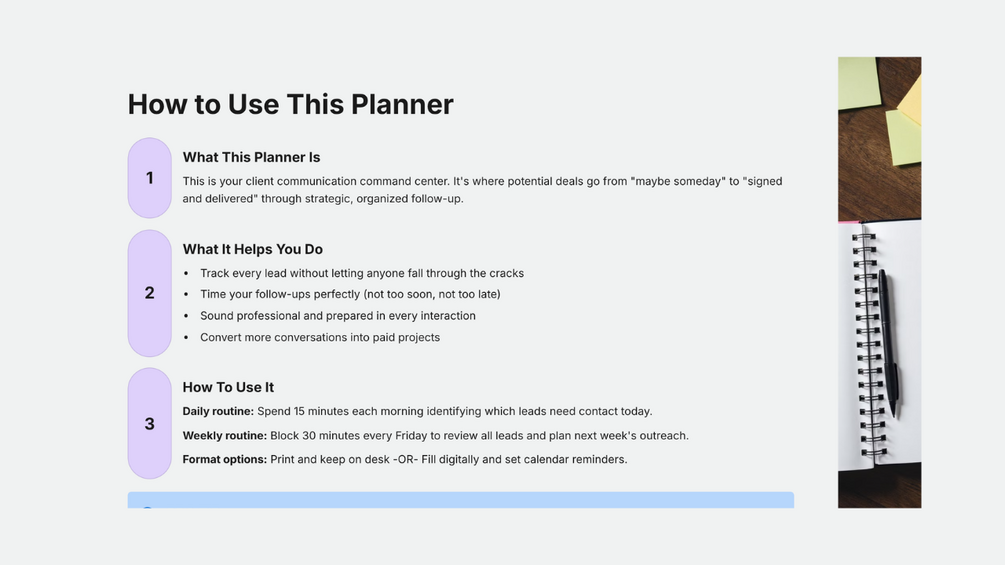 Real talk: use this planner consistently and you’ll convert leads you didn’t even think you had a shot at. Freelancers, consultants, and agencies swear by it.