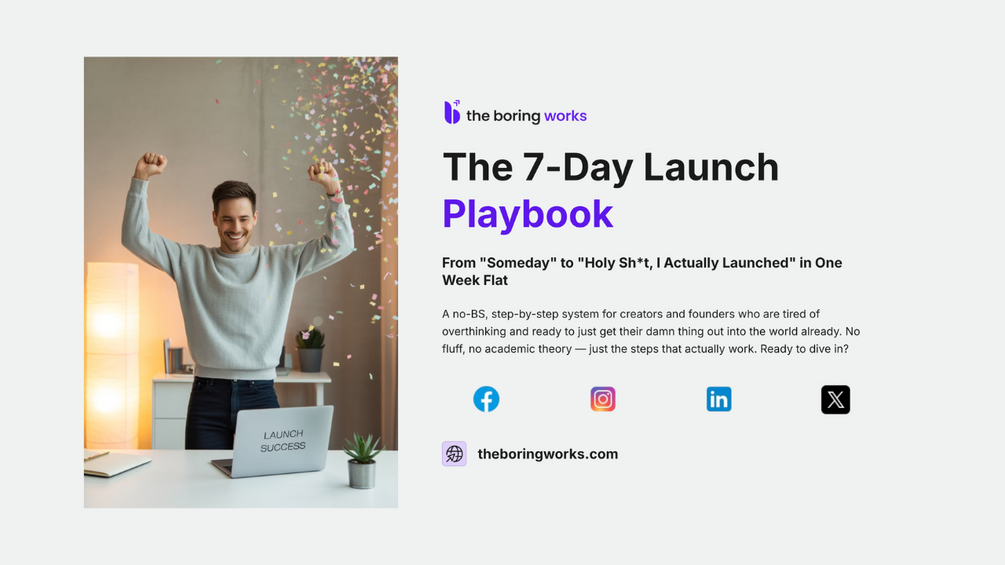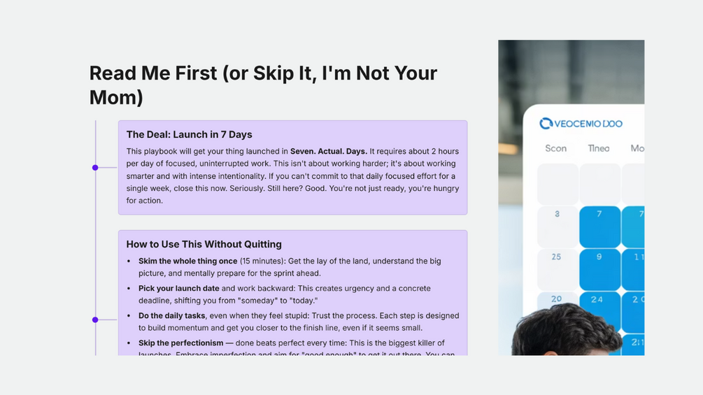 Enter the 7-Day Launch Playbook — a simple, no-BS roadmap to go from “thinking about it” to “holy sh*t, it’s live” in one week flat.